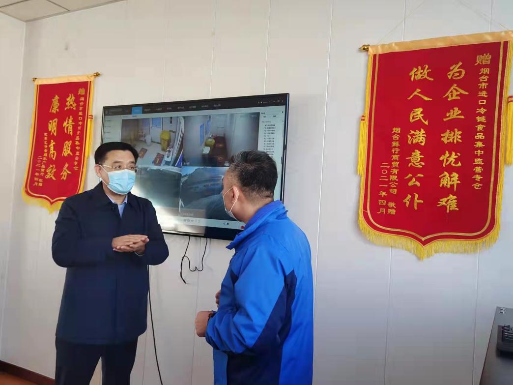 谭克良一行首先来到烟台市进口冷链食品集中监管专仓,通过海昌公司负责人马松鹏的现场讲解,并从现场视频监控查看专仓一线工作人员的作业情况,详细了解冷链专仓工作流程及人员防护的相关情况。